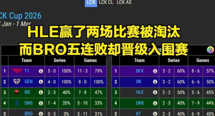 一个转会期砸下重金、纸面实力几乎拉满的阵容,在“十进九”这种接近保送的赛制下翻车,本身就已经足够魔幻,更讽刺的是,HLE并非摆烂队,他们拿到的是2胜3负,而0胜5负的BRO却能名正言顺站上入围赛舞台,这种强烈反差,自然会引发关于赛制公平性的争论。