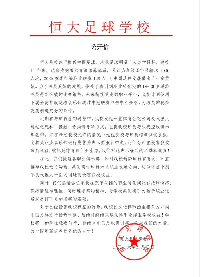 2月3日,恒大足校曾在学校官方公众号发布措辞严厉的公开信。指责某些中间人“阻挠我校球员与我校控股俱乐部签约,并在未经我校允许的情况下无视我校与球员培训协议条款,向相关职业俱乐部进行兜售并表示要强行带走。”
