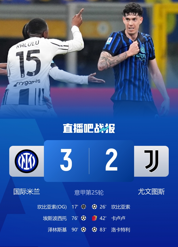 卡卢卢第二黄引争议,皮奥·埃斯波西托破门,泽林斯基绝杀,最终国际米兰3-2尤文图斯,8分优势领跑积分榜。