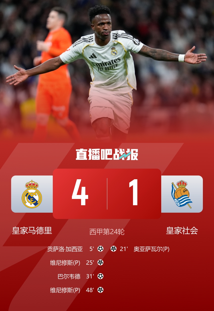 巴尔韦德远射破门,维尼修斯点射双响,最终皇马4-1皇社。