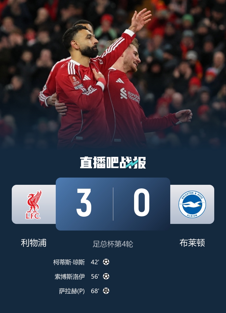 琼斯、索博斯洛伊破门,萨拉赫造点并亲自主罚命中。最终利物浦3-0击败布莱顿,晋级足总杯16强。