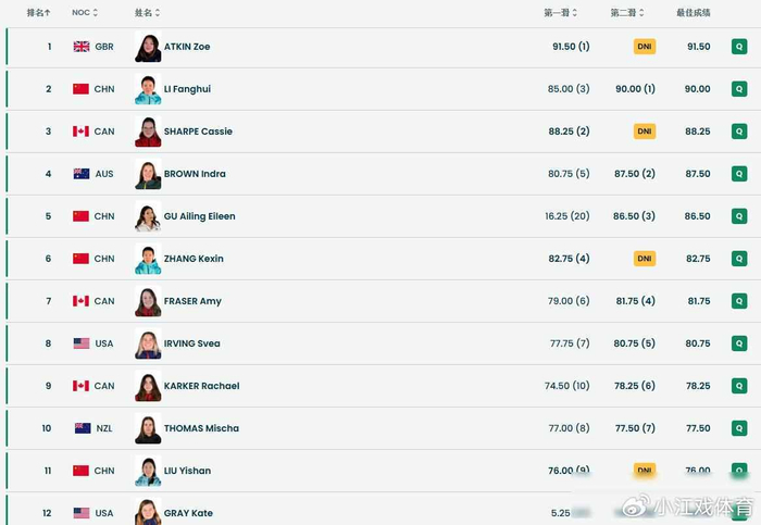 2月20日凌晨的米兰冬奥会自由式滑雪U型场地预赛中,谷爱凌第一跳出现失误摔倒,仅得16.25分,排名第20位,几乎失去晋级机会,但第二跳她稳定发挥,取得86.50分,一路升至第五名,成功进入决赛,李方慧以90分位列第二,张可欣82.75分排第六,刘奕杉76分居第十一,四位选手全部晋级决赛,这是中国队历史上首次实现这一成绩。