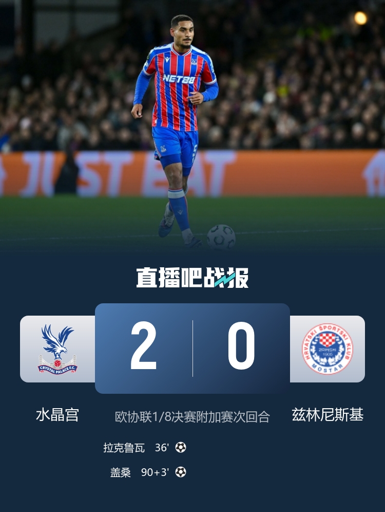 欧协联附加赛次回合,沃顿助攻拉克鲁瓦头球首开记录,盖桑破门,水晶宫2-0总比分3-1兹林尼斯基晋级16强。