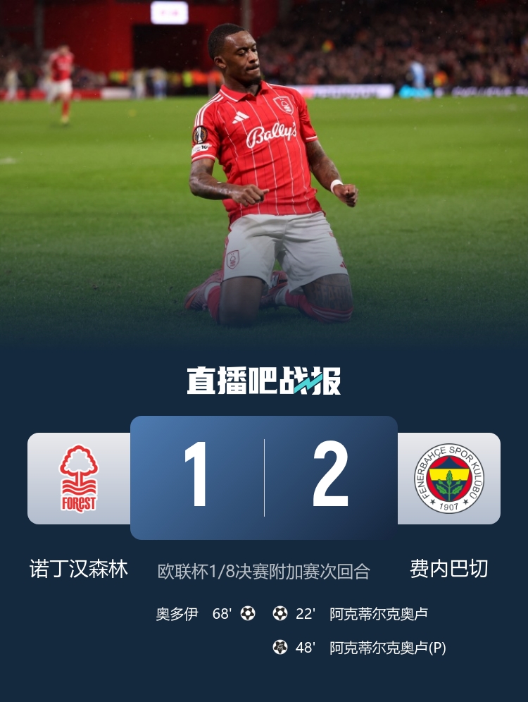 欧联杯1/8决赛附加赛次回合,奥多伊替补建功,阿克蒂尔克奥卢双响。诺丁汉森林1-2总比分4-2费内巴切晋级欧联杯16强!
