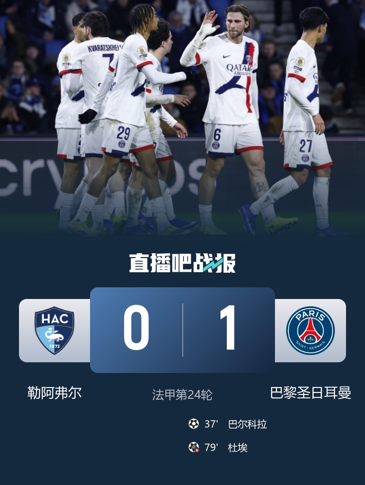 巴黎1-0击败勒阿弗尔,以4分优势领跑法甲。巴尔科拉打进本场唯一进球。