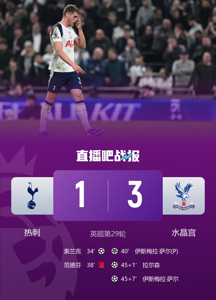 五连败+11轮不胜!十人热刺1-3水晶宫 范德芬送红点萨尔双响