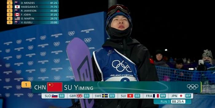 苏翊鸣的动作和姿势质量都非常高,最后获得88.25分,日本选手木村葵来拿到89.00分,暂时超越苏翊鸣升至第一,同时另外一位日本选手木俣椋真第一跳1980抓板获得86.25分,暂排第三。