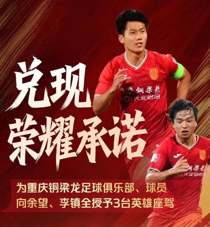 重庆车企兑现此前承诺,重庆铜梁龙俱乐部以及向余望、李镇全两名球员授予三台汽车的使用权!