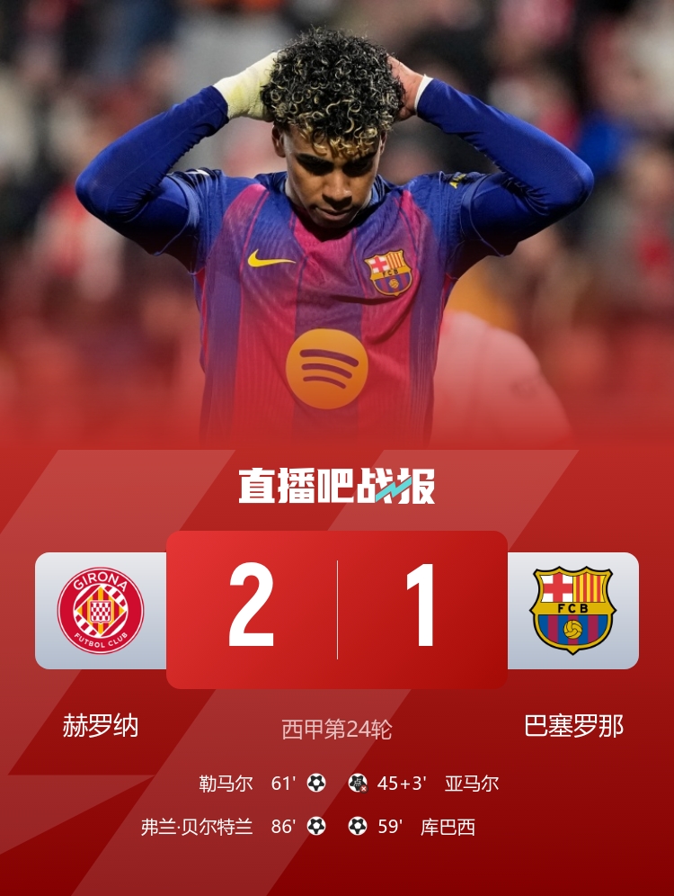 西甲第24轮,赫罗纳主场2-1巴塞罗那,亚马尔失点,库巴西破门,贝尔特兰绝杀。