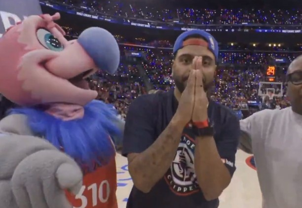 比赛间歇时快船主场举行球迷互动活动,一名身穿快船球衣的球迷中圈投篮命中,赢得1万美元!