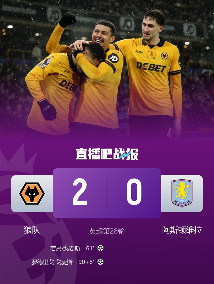 英超第28轮,狼队主场2-0战胜阿斯顿维拉,若昂·戈麦斯、罗德里戈·戈麦斯破门。