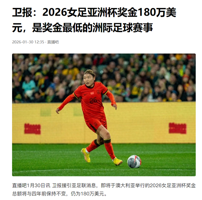 今年2月初,《卫报》援引亚足联的消息,2026女足亚洲杯的奖金总额与四年前保持不变,仍为180万美元,远不如2025年女足欧洲杯的4720万美元、2024年女足非洲杯的347.5万美元。